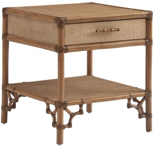 The Bayfront rectangular end table has a leather-wrapped rattan frame with bracketed fretwork at the base. The entire top, sides and back, as well as the bottom shelf are clad in woven raffia and there is one soft-close drawer.Read More