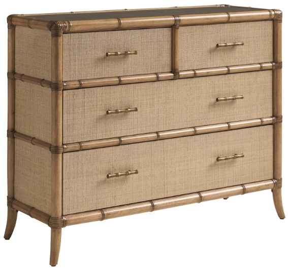 The Dolphin Cay hall chest has a leather-wrapped bamboo frame, clad in woven raffia on the top and sides, with a protective glass insert in the top. The design features four soft-close drawers with woven raffia front panels.Read More