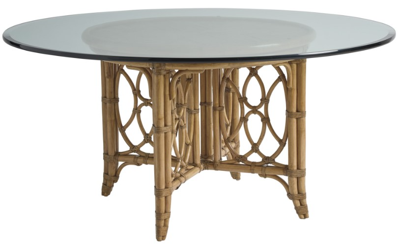 The 37-inch diameter Emerald Bay table base features a bamboo veneered top and leather-wrapped rattan base. It is paired with a 54-inch diameter glass top that is .75-inches thick with a 1-inch bevel.Read More