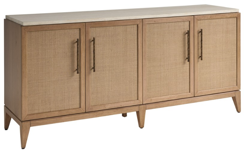 The Biscayne buffet features a 1-inch thick veneered travertine top, and four doors with woven raffia front panels. Behind each pair of doors is one adjustable shelf and one soft-close drawer with a woven raffia front panel.Read More