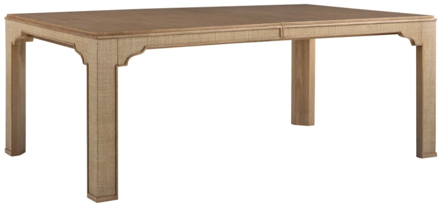 The 76-inch Sandy Lane dining table features a straight-cut bamboo veneered top and woven raffia clad apron and legs. The table extends to 120-inches with two 22-inch leaves. With both leaves, the dining table comfortably seats 12 guests.Read More