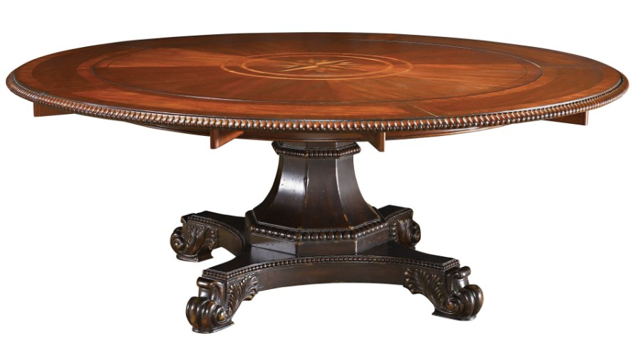 Inspired by journeys around the globe, the table showcases a compass-point inlay that glows against the burnished brown cassis finish. The pedestal is finished in the complementary tamarind finish and is detailed with beaded molding and scrolled feet.Read More