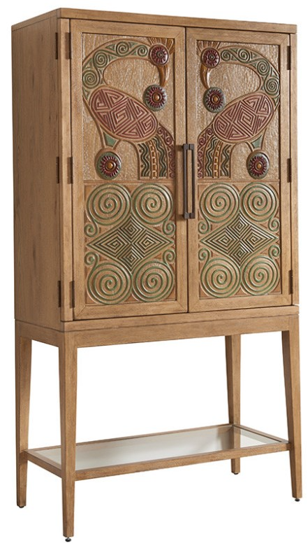 The bar cabinet is a statement piece in the collection. The doors are hand-painted and open 270 degrees to reveal a drop-front and two adjustable tempered glass shelves, dimmable lighting and a mirrored back panel.Read More