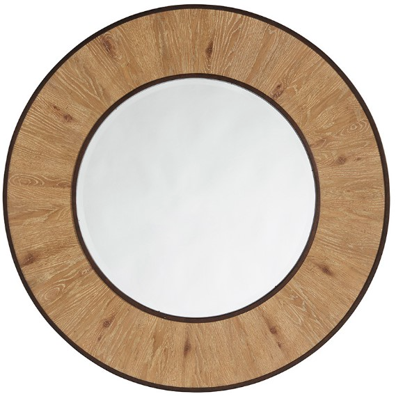 An aged bronze finished metal frames the beveled mirror and perimeter of the knotty oak veneers which radiate out from the center. The design visually enlarges the space and accents any room of the home.Read More