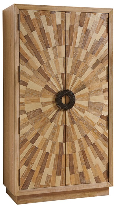 The cabinet features a random radial pattern of white ash, oak, pecan and walnut veneers. Behind the doors are three adjustable shelves, two stationary shelves, four self-closing drawers and grommets for wire management.Read More