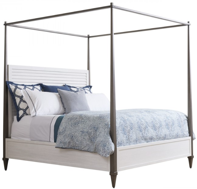 The Coral Gables poster bed makes a grand statement, blending a louvered headboard panel with tapered metal posts and removable canopy frame finished in aged pewter. Make a bold statement to your bedroom area.Read More