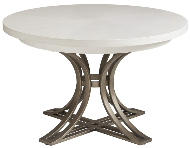 The smaller of the two round dining tables, this Marsh Creek 48-inch diameter features a radial matched veneer top on a metal base in a burnished pewter finish. This size would also be good as a game table.Read More