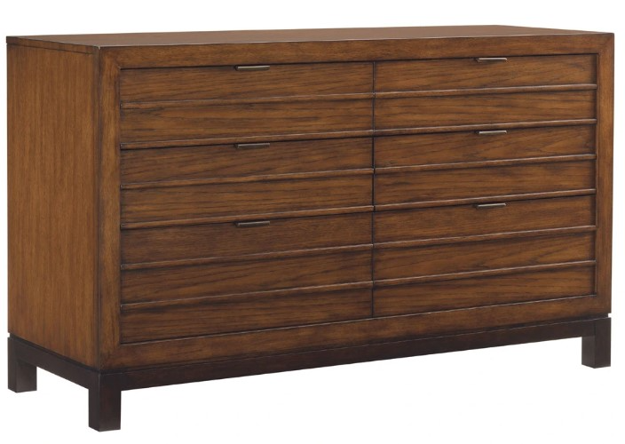 The six drawers provide two depths for wardrobe storage with easy access tab pulls blending into the horizontal lines of the dresser. The bottom platform is a darker finish to purposely portray the foundation of design.Read More