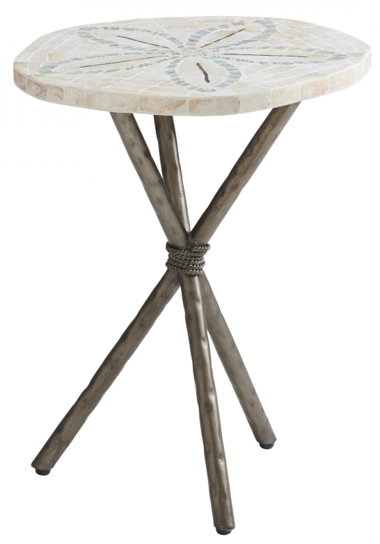 The Sand Dollar end table pairs a hammered metal base in aged pewter with an inlaid top featuring a sand dollar pattern of shells in aquamarine, white, ivory and gray. Each top is hand-crafted, so patterns will be unique to each table.Read More