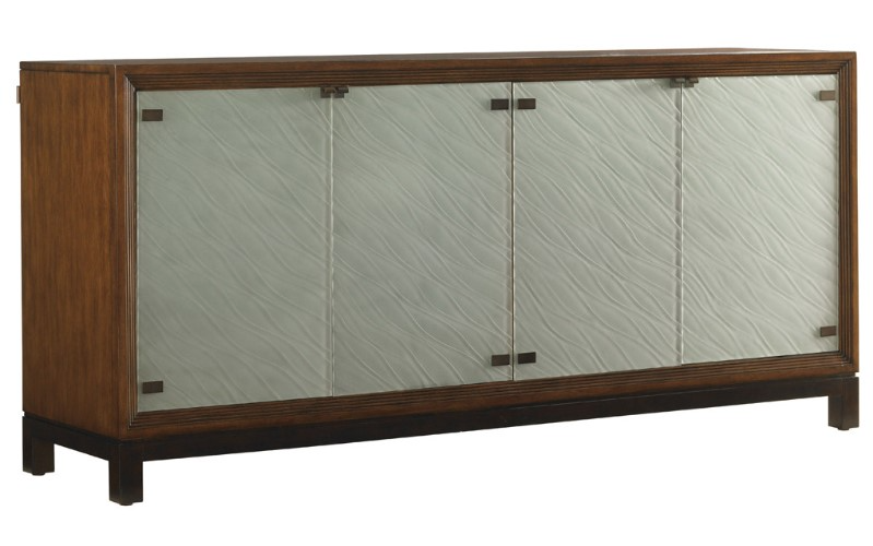 The four sand blasted glass doors create a visual wave in their texture and illuminate sea blue with the interior lighting. Behind the doors are two adjustable glass shelves and two felt lined drawers, one is divided for silver. Serving elegance.Read More