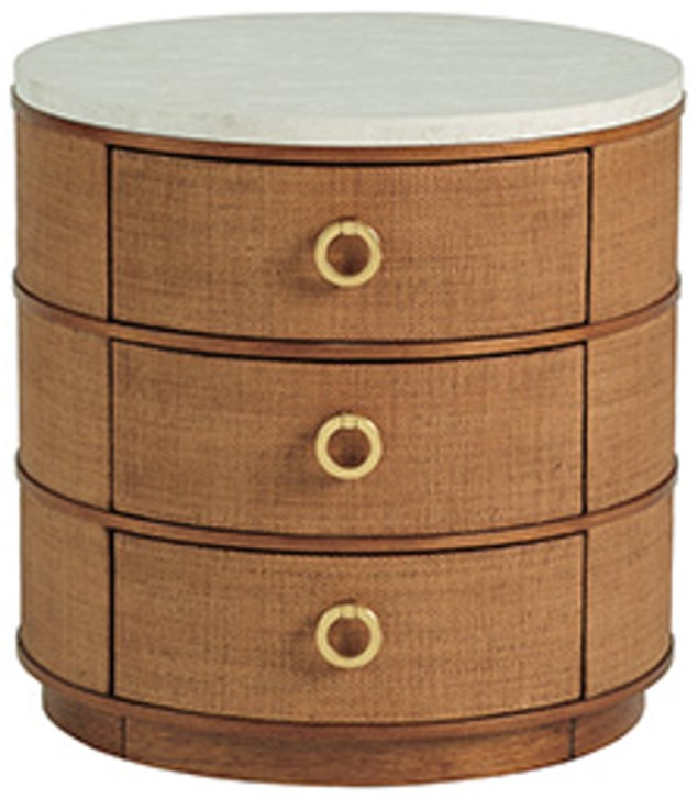 The 24-inch round lamp table blends a woven raffia exterior with a veneered anticato marble top. Three storage drawers feature custom ring pulls in a brushed gold finish. This will make a bold statement to your living area.Read More