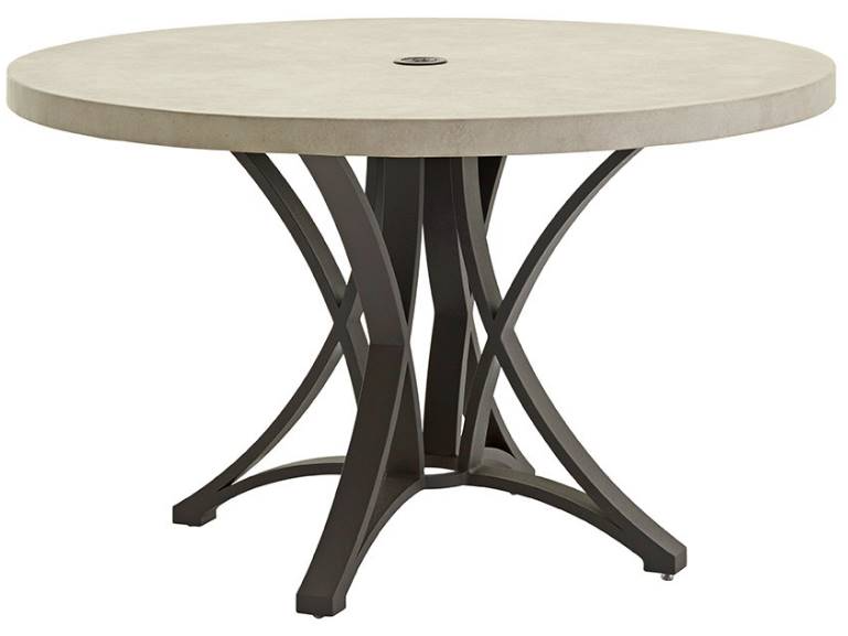 Enjoy outdoor dining with your choice of stationary or swivel rocker chairs around the 48-inch dining table. The weather stone top has the look of honed limestone, with exceptional durability above a striking aluminum base in a custom aged iron finish.Read More