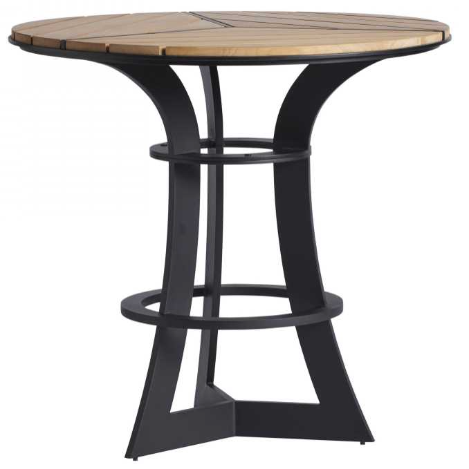 The bistro table features three sections of planked teak above an interesting angled tripod base with circumference rings. The conversion from high to low is a six-inch section with a ring, so you may choose counter or bar height and purchase the coordinating height stool.Read More